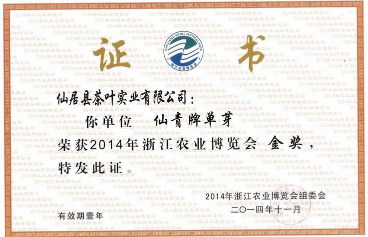 我公司生產(chǎn)的“仙青牌單芽”榮獲2014年浙江省農(nóng)業(yè)博覽會金獎